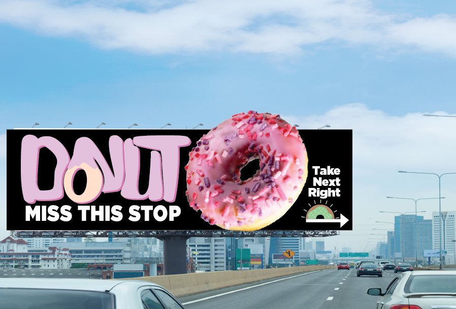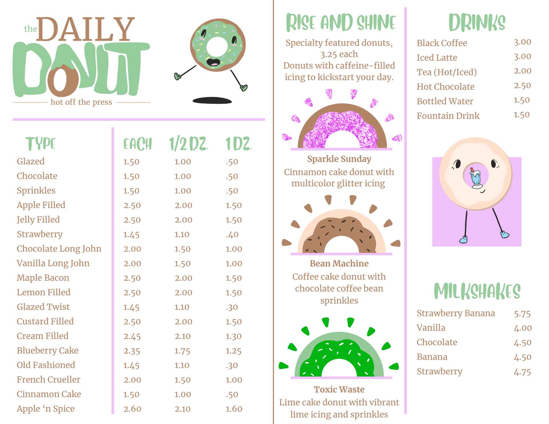 The idea was to make a donut brand that was bright and fun. We decided that there wasn't anything more fun than donuts and pastel colors, so we ran with it. There are special donuts on the menu that change every day so we combined it with a serif font and marketed it similar to a daily news brand.